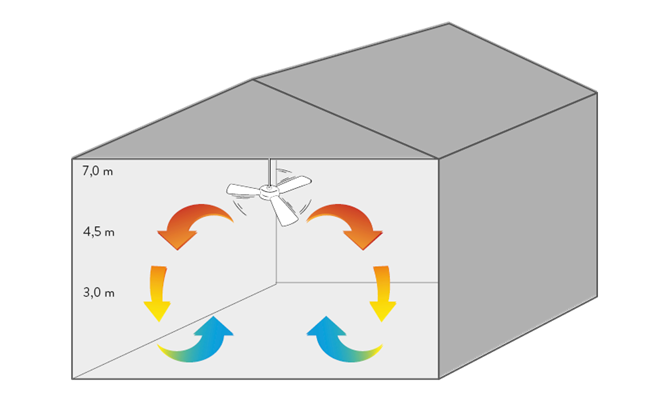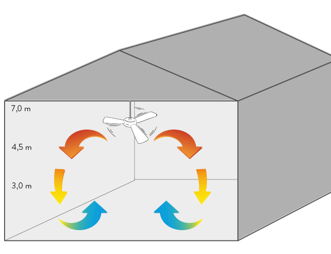 Ob in Messehallen oder Event-Zelten: Bei großen Raumhöhen steigt die Warmluft immer nach oben. Das sorgt für einen enormen Temperaturunterschied zwischen Decke und Boden – und treibt die Heizkosten deutlich in die Höhe. Herkömmliche Ventilatoren bringen nämlich ab einer Höhe von 3 Metern zu wenig gezielte Bewegungsenergie.
