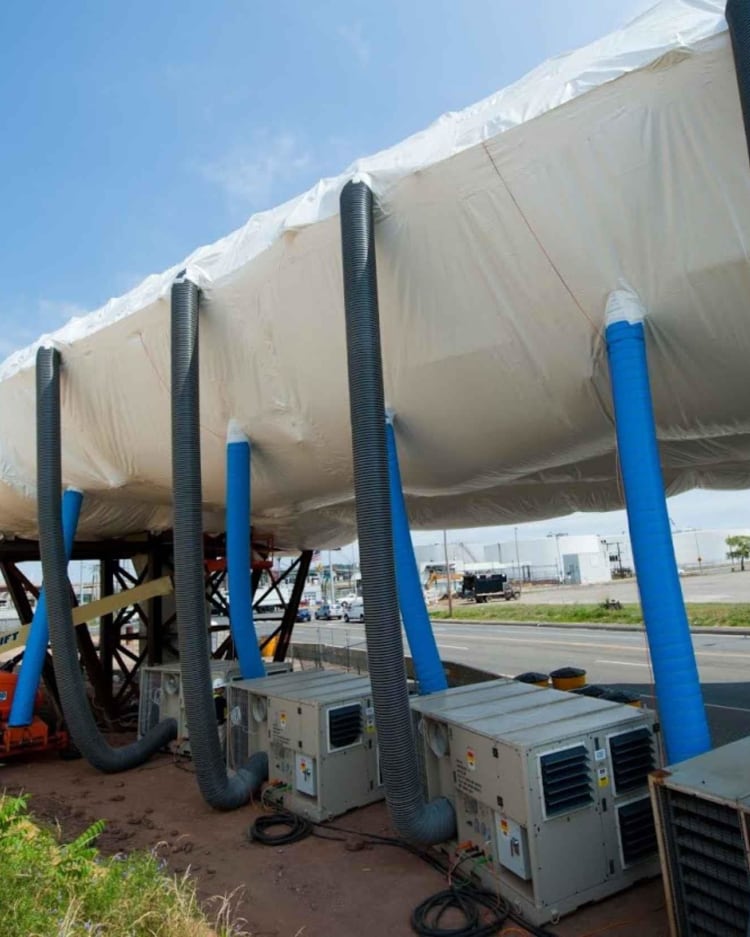 We provide the skills and equipment to deliver a climate that reduces the threat from corrosion and condensation during annual maintenance shutdowns, refit work and repairs. Our expertise also eliminates coating failures due to excess moisture, minimises weather-related delays and reduces warranty claims.