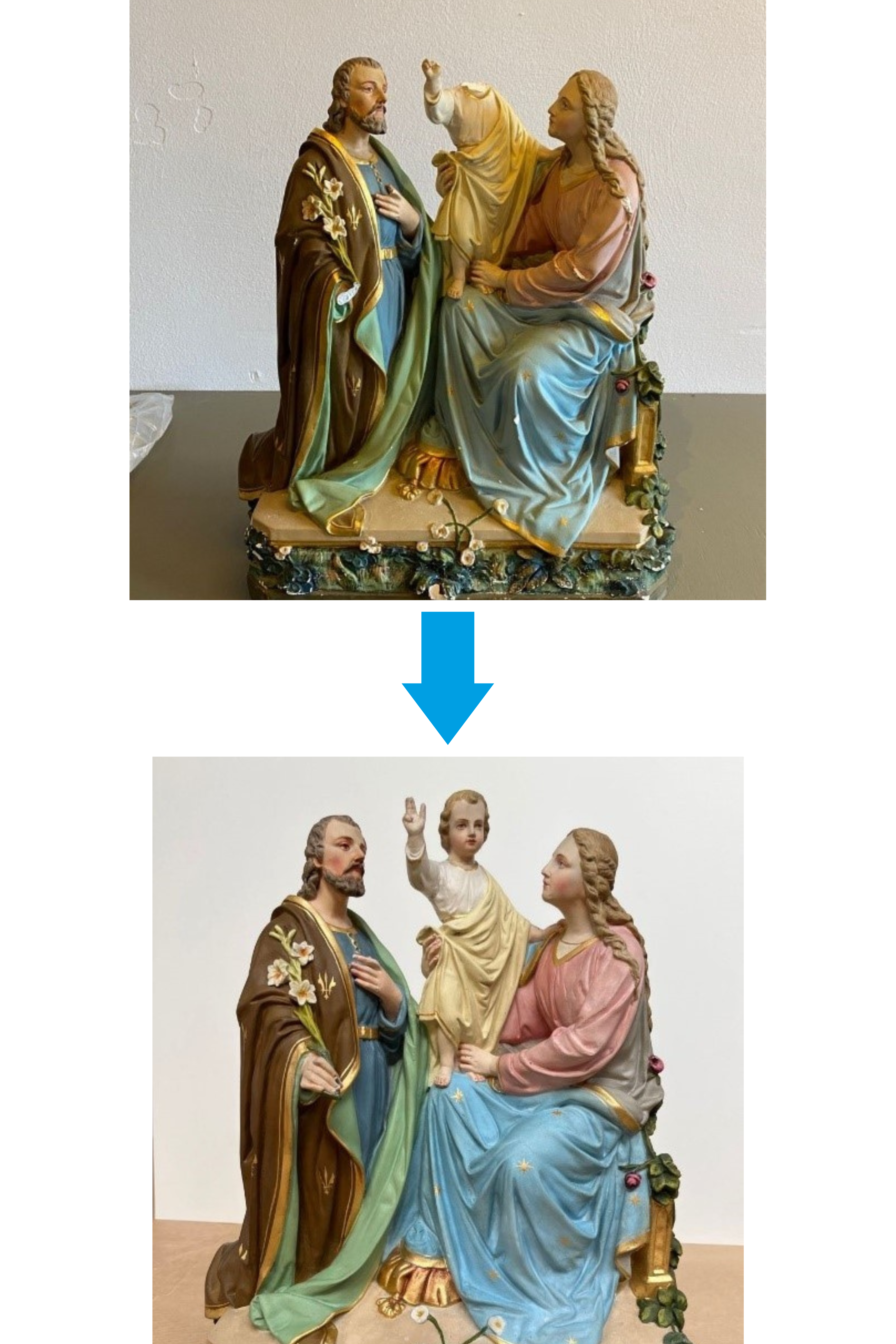 The objects in question were 35 religious statues and statuettes of varying sizes and conditions. After an event like this, the first step is to secure and transport the delicate art to a facility where the restoration will take place. Only the transport requires careful handling and efficient planning, in order not to accidentally further damage the objects. Another important task is to register the broken off parts and place these fragmental bits in safety for the upcoming restoration. With the help from the museum’s staff, everything was registered, secured and successfully transported to a Polygon facility in Beekbergen.