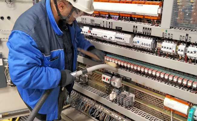 Hedi Derouiche, project manager in Polygon France, explains the process. “A vacuuming technique was used, to gather all the powder from the cabinet. In spots where the vacuum couldn’t access, we use a waterless microfiber rag. This rag is dielectric, meaning that it does not conduct any electricity”, he explains.