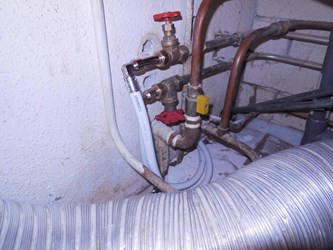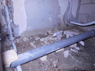 In plaats van het verwijderen van een vloertegel werd een tegelblok onder het ligbad, waar de CV-leiding onderdoor liep, gedemonteerd. Daar werd een bypass gemaakt naar de CV-leiding van de radiator. De lekke leiding werd doorgezaagd, vanaf onder het bad werd een dunnere leiding door de lekke leiding in de vloer getrokken naar de open ruimte achter het toilet. Vanaf daar kon de leiding weer in het ketelhuis worden aangesloten. Het tegelblok werd weer terug gemonteerd onder het bad. Na het voegen waren de sporen van de lekkage en het herstel niet meer te zien.