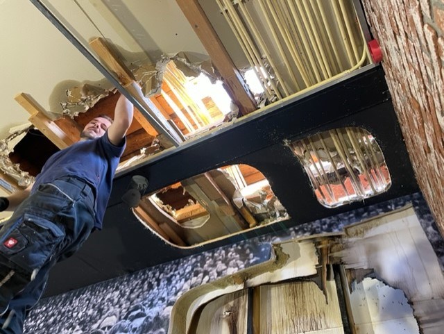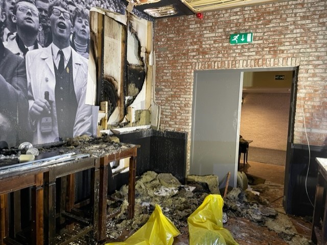 Jaap vertelt: “wij zijn de zondag direct gestart met wegzuigen van het bluswater, het opruimen van de brandresten, het dichtmaken van het dak, het plaatsen van drogers en een eerste reiniging van de keuken en het plaatsen van ontgeuringsapparatuur. Ook hebben we een installateur geregeld om de stroom en gasvoorziening te checken.”