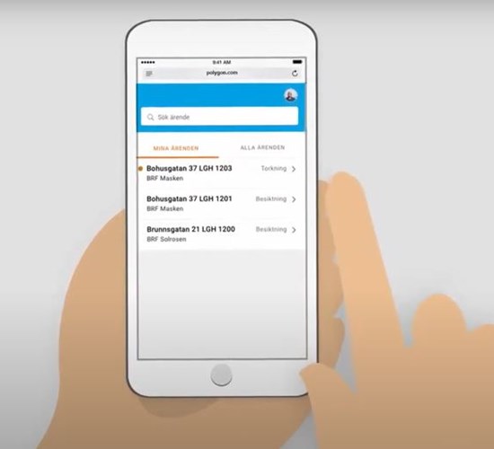 När de boende klickar på länken kan de i Spark se en översikt av deras ärende. Där kan de genom ett enkelt knapptryck även ge Polygons tekniker tillstånd att komma in i deras fastighet med huvudnyckeln.